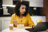 Young Black woman sitting at table eating salad with fork while working on laptop in modern office kitchen, takeaway coffee cup placed nearby, focused expression on face