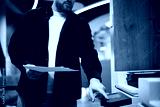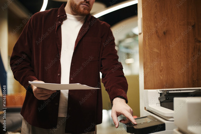 Man operating printer while holding documents in modern coworking office setting, focusing on using device for copying or scanning paperwork, face partially visible