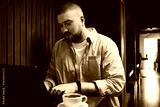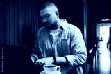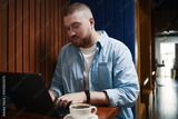Caucasian young man working on laptop at table in cafe, focusing on screen with hands typing keyboard, short hair and beard visible, coffee cup placed in foreground