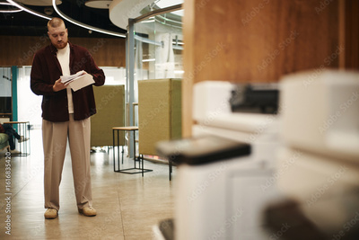 Caucasian young man standing in modern office holding documents and reading papers near printer, open workspace visible in background, business environment, professional setting