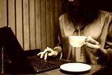 Young woman working on laptop while holding coffee cup, sitting at wooden table with empty saucer, focusing on screen, partial face visible, curly hair framing face