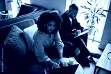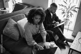 Young Black woman using laptop while sitting on sofa, Caucasian man writing on clipboard in background, both focused on work in modern indoor office setting