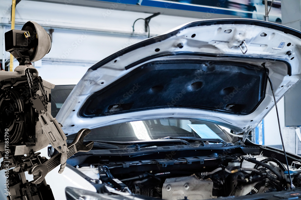 robot holding a wrench repairing a car, representing futuristic smart automotive maintenance technology