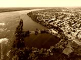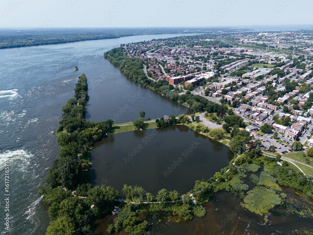 Aerial view of Lachine Rapids and residential area near Saint Lawrence River in Montreal, Canada. g.