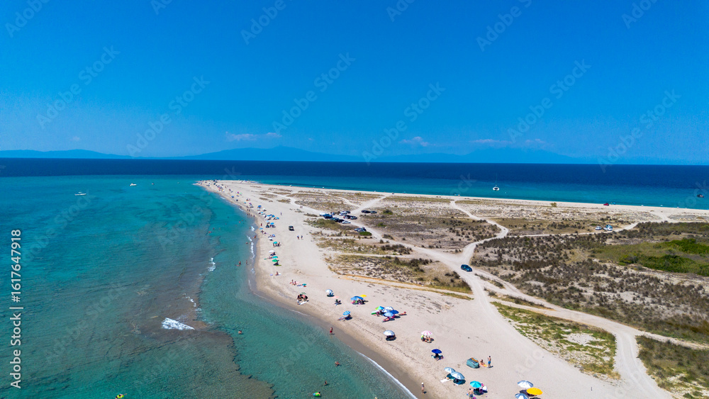 Drone (aerial) view of beautiful beach on Possidi Cape on Kassandra peninsula, Halkidiki (Chalkidiki), Greece