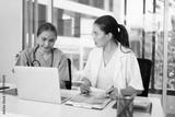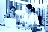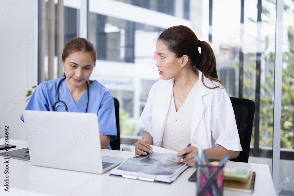 Female doctor and nurse working together with clipboard and laptop for in modern clinic.