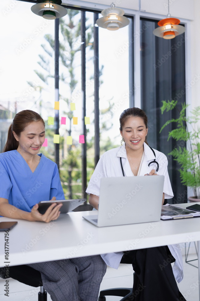 Female doctor and nurse working together with clipboard and laptop for in modern clinic.