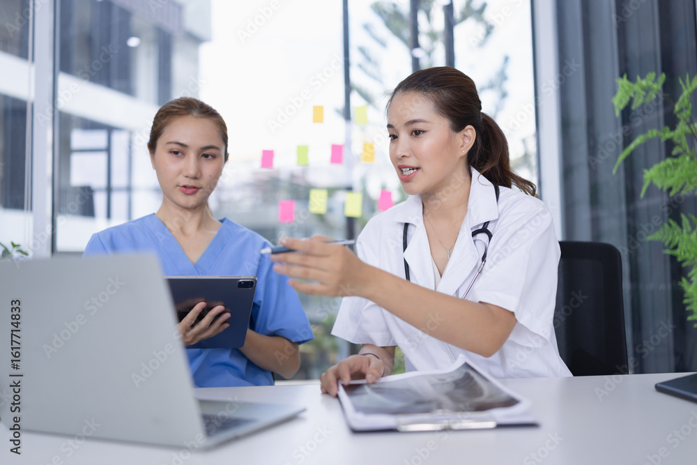 Female doctor and nurse working together with clipboard and laptop for in modern clinic.