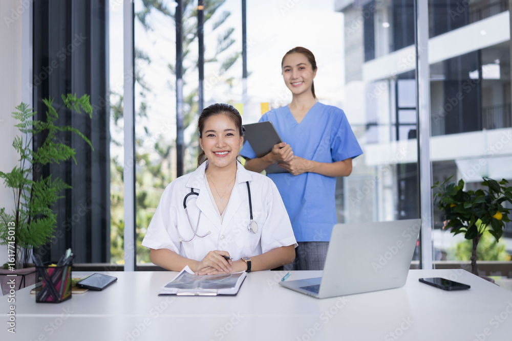 Female doctor and nurse working together with clipboard and laptop for in modern clinic.