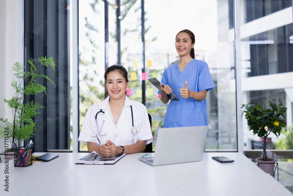 Female doctor and nurse working together with clipboard and laptop for in modern clinic.