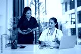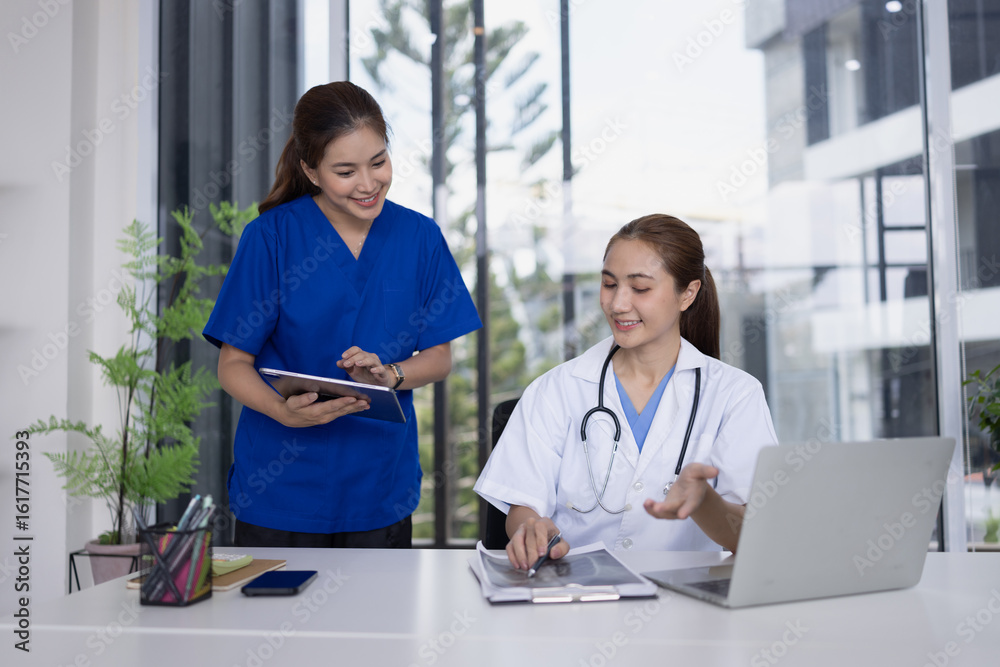 Female doctor and nurse working together with clipboard and laptop for in modern clinic.