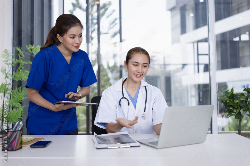 Female doctor and nurse working together with clipboard and laptop for in modern clinic.