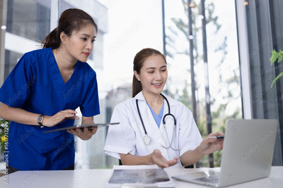 Female doctor and nurse working together with clipboard and laptop for in modern clinic.