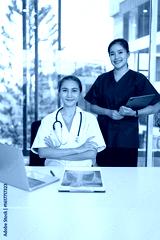 Female doctor and nurse working together with clipboard and laptop for in modern clinic.
