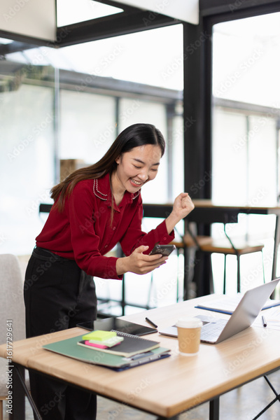 Excited Asian woman holding smartphone and project business planning in modern office.