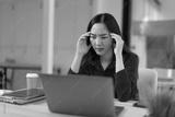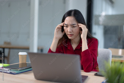 feeling stressed asian businesswoman working on laptop sitting at desk in modern office space for work online.