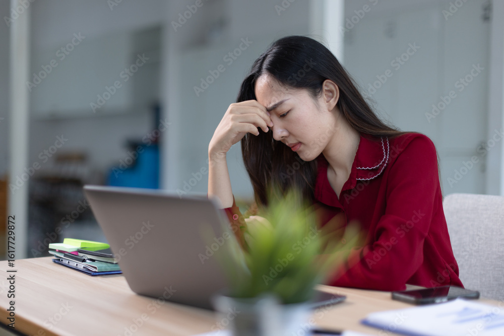 feeling stressed asian businesswoman working on laptop sitting at desk in modern office space for work online.