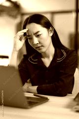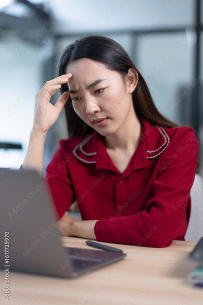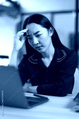 feeling stressed asian businesswoman working on laptop sitting at desk in modern office space for work online.