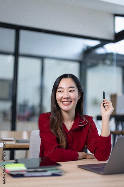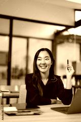 hispanic asian woman using laptop computer in office.