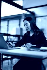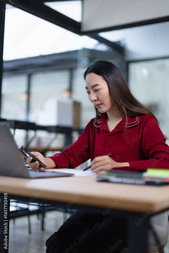 Asian woman talking on smartphone with laptop and project business planning in modern office.