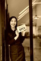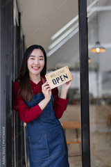 Young Asian Businesswoman Owner with Open sign, Store Owner And Open Sign.