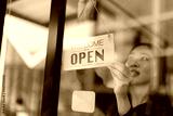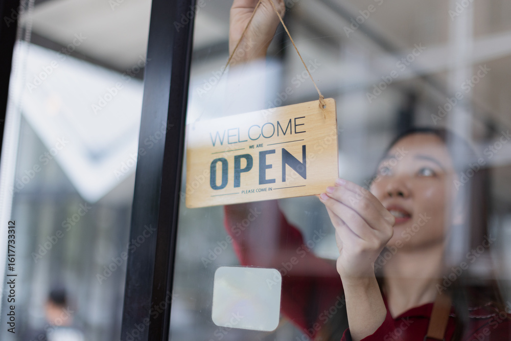 Young Asian Businesswoman Owner with Open sign, Store Owner And Open Sign.