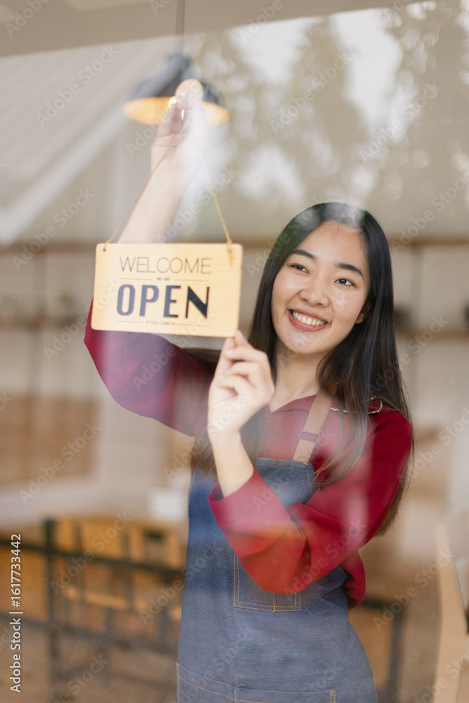 Young Asian Businesswoman Owner with Open sign, Store Owner And Open Sign.