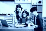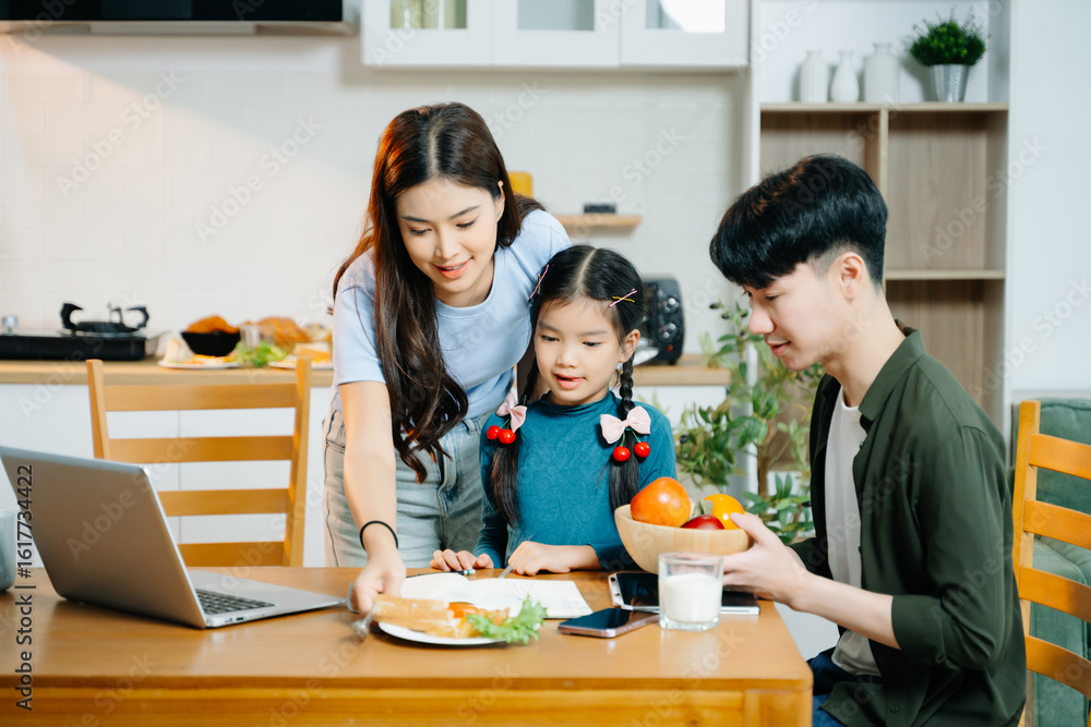 Asian family waves and smiles during a joyful video call at home. Parents and daughter connect digitally, sharing love