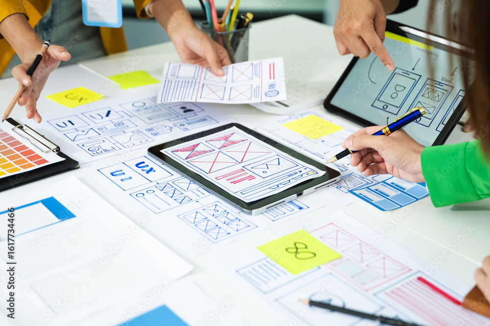Creative team collaborating on UX/UI wireframe designs for a mobile app. Hands on planning, sketching, and teamwork