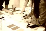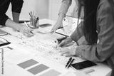 Creative team collaborating on UX/UI wireframe designs for a mobile app. Hands on planning, sketching, and teamwork