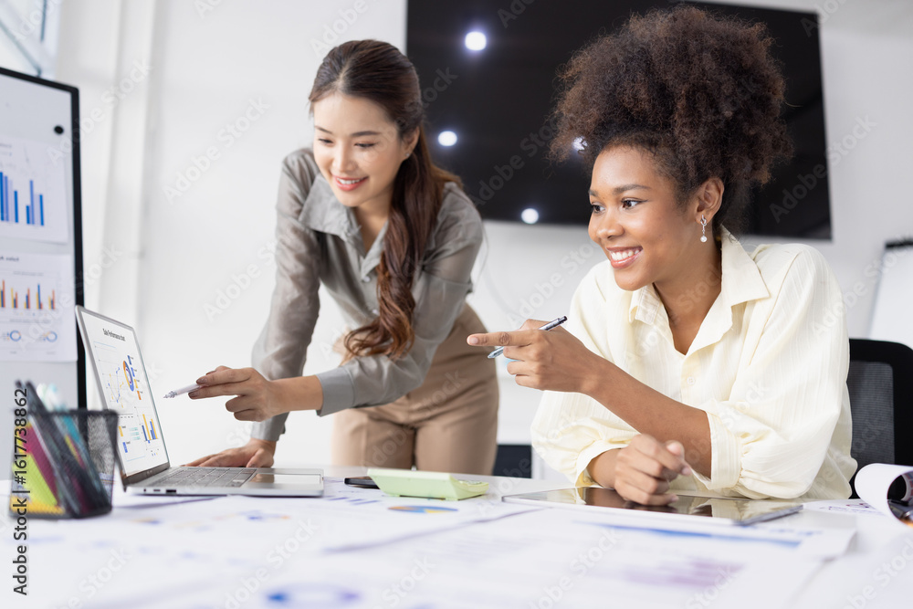 Two business woman working together for analysis data plan business strategies at desk in office, Business discussing and startup concept.