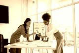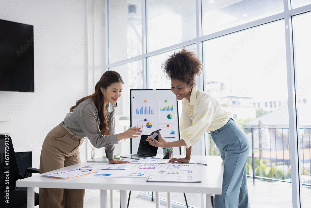 Two business woman working together for analysis data plan business strategies at desk in office, Business discussing and startup concept.