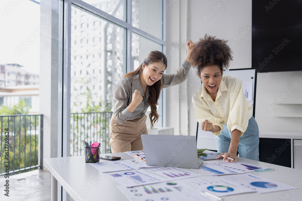 Excited celebrating two business woman working together for analysis data plan business strategies at desk in office, Business discussing and startup concept.