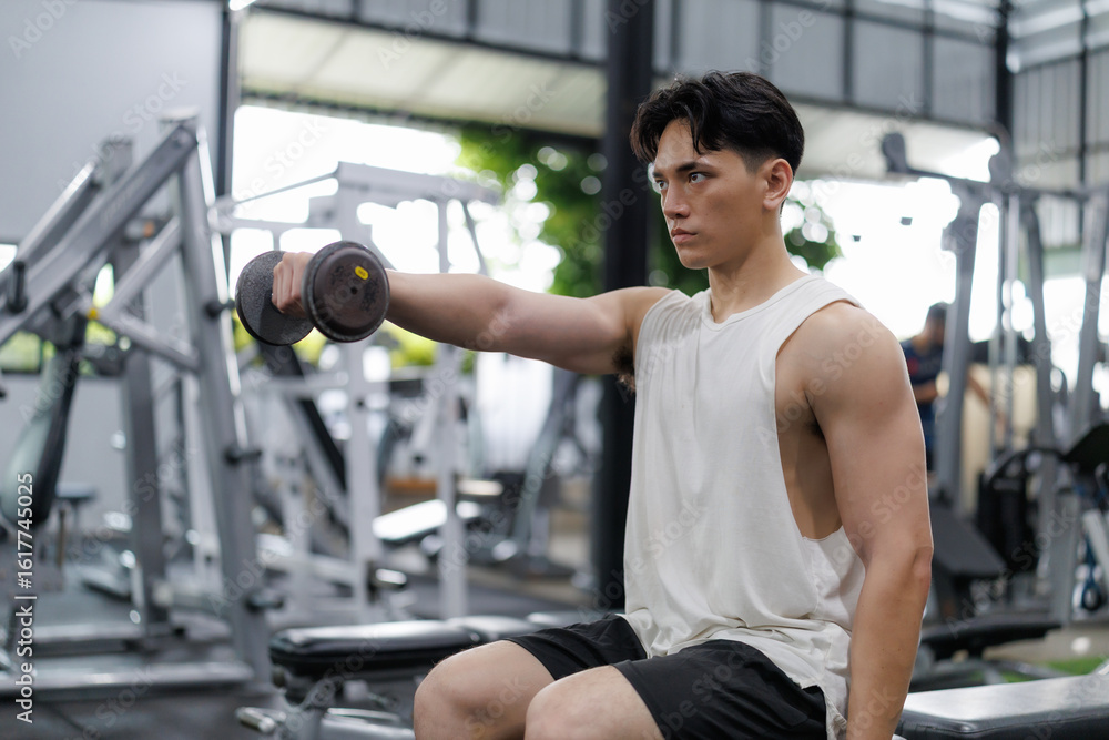 Young sportsman lifting dumbbell while sitting on bench in gym