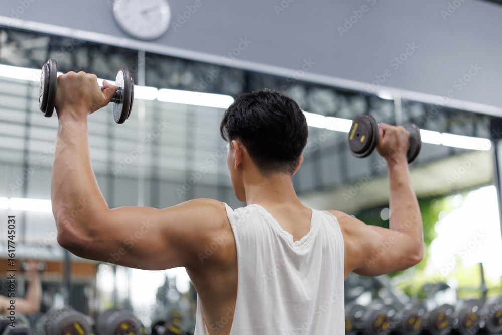 Bodybuilder lifting dumbbells in gym showing back muscles