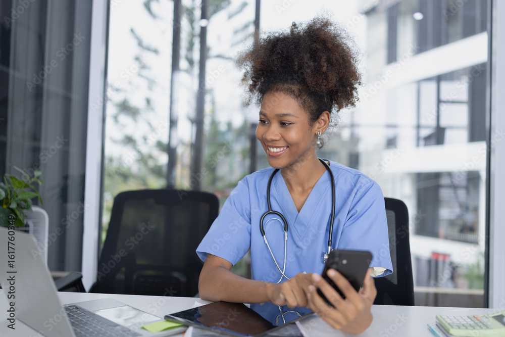 African American female doctor using mobile phone with laptop working at clinic office, Medical and health care concept.