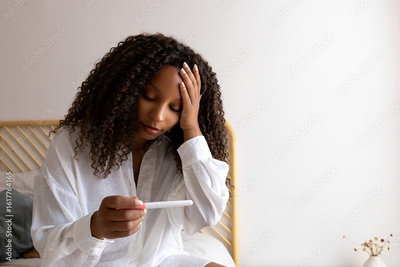 Sad African American woman checking negative pregnancy test. Unexpected unwanted pregnancy.