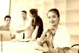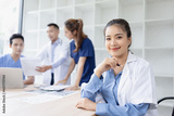 A young female doctor smiling looking at the camera in meeting room, Medical team reviewing data.