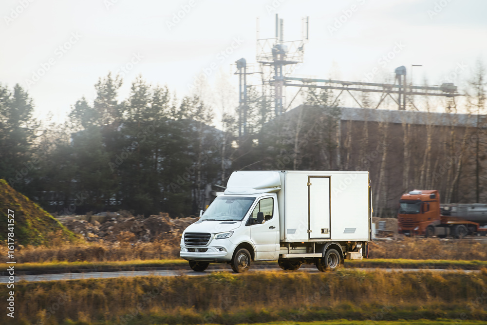 Delivery vehicle passing countryside area
