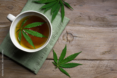 Hemp herbal tea and green hemp leaves