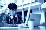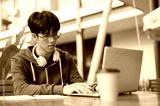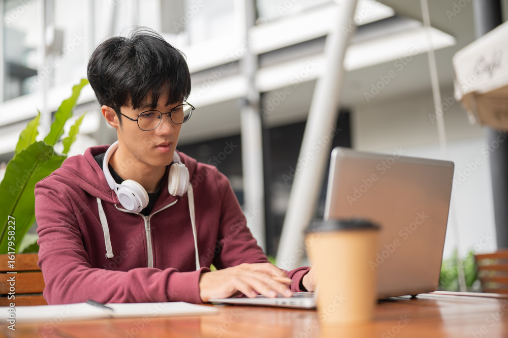 Glasses asian man holding pencil typing on laptop while sitting with coffee at wooden table in cafe.
