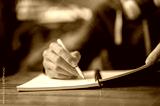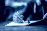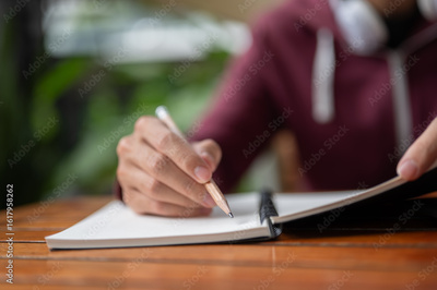 Close up college student man holding pencil writing or drawing in notebook at wooden table in a cafe