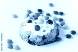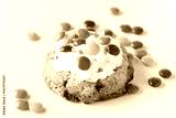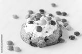 Fresh chocolate American chip cookie decorated with multicolored candies on white background. Flat lay of cookies with chocolate colored candies inside