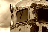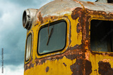 Close-up of an old locomotive and old carriages on a decommissioned railway, the paint cracked, peeled and rusted.