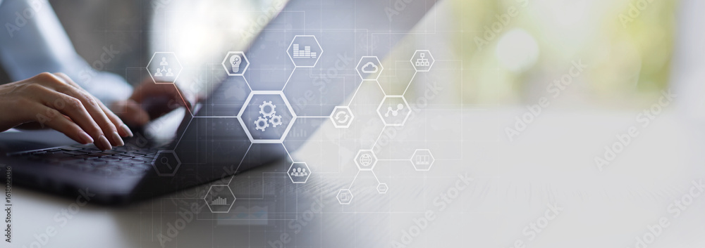 Digital Collaboration, Automation, and Data Analysis for Business Optimization on a Wide Banner, Business and Technology Concept.
