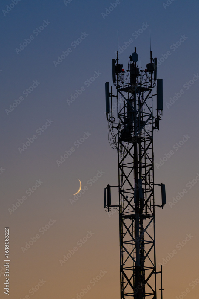 Communication tower with moon in clear sunset sky vertical