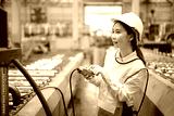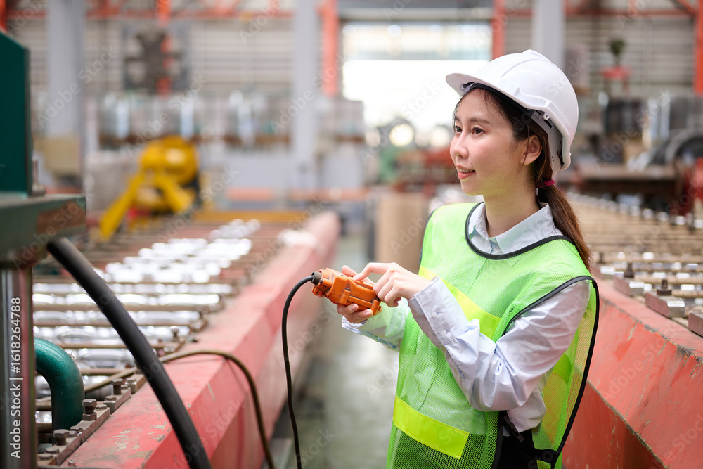 Engineer or worker operating remote switch to control machine in the factory