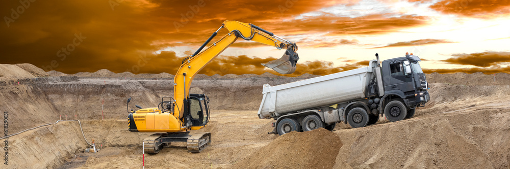Ein Bagger belädt einen LKW und schaufelt eine Baugrube für das Fundament von einem neuen Wohnhaus - FOTOMONTAGE