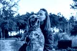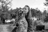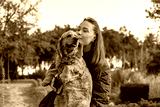 A young Caucasian woman with long brown hair kisses a golden cocker spaniel. They are outdoors in a park with greenery in the background.