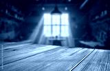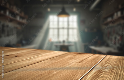 Empty table with product space in artisan workshop with natural window light. Showcasing handmade goods, tools, branding mockups, DIY products or creative workspace concepts.
